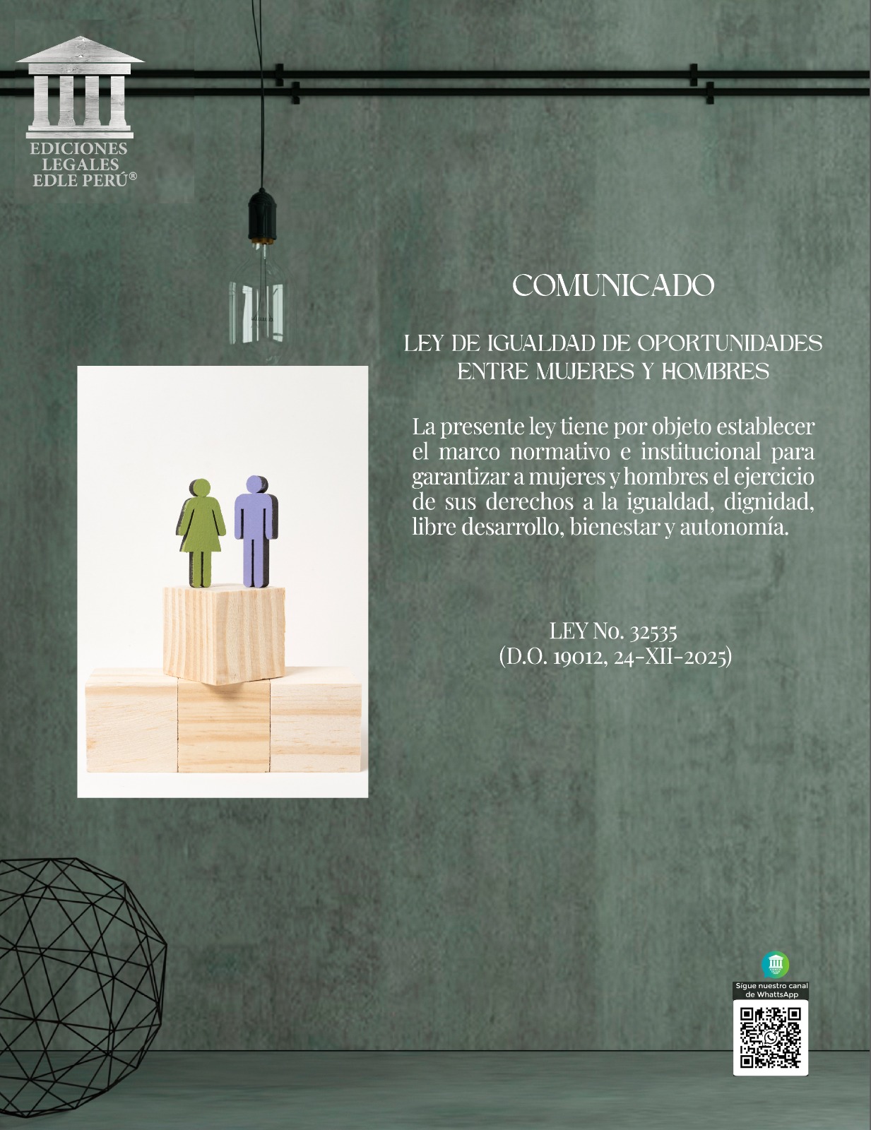 La presente ley tiene por objeto establecer el marco normativo e institucional para garantizar a mujeres y hombres el ejercicio de sus derechos a la igualdad, dignidad, libre desarrollo, bienestar y autonomía. LEY No. 32535 (D.O. 19012, 24-XII-2025)