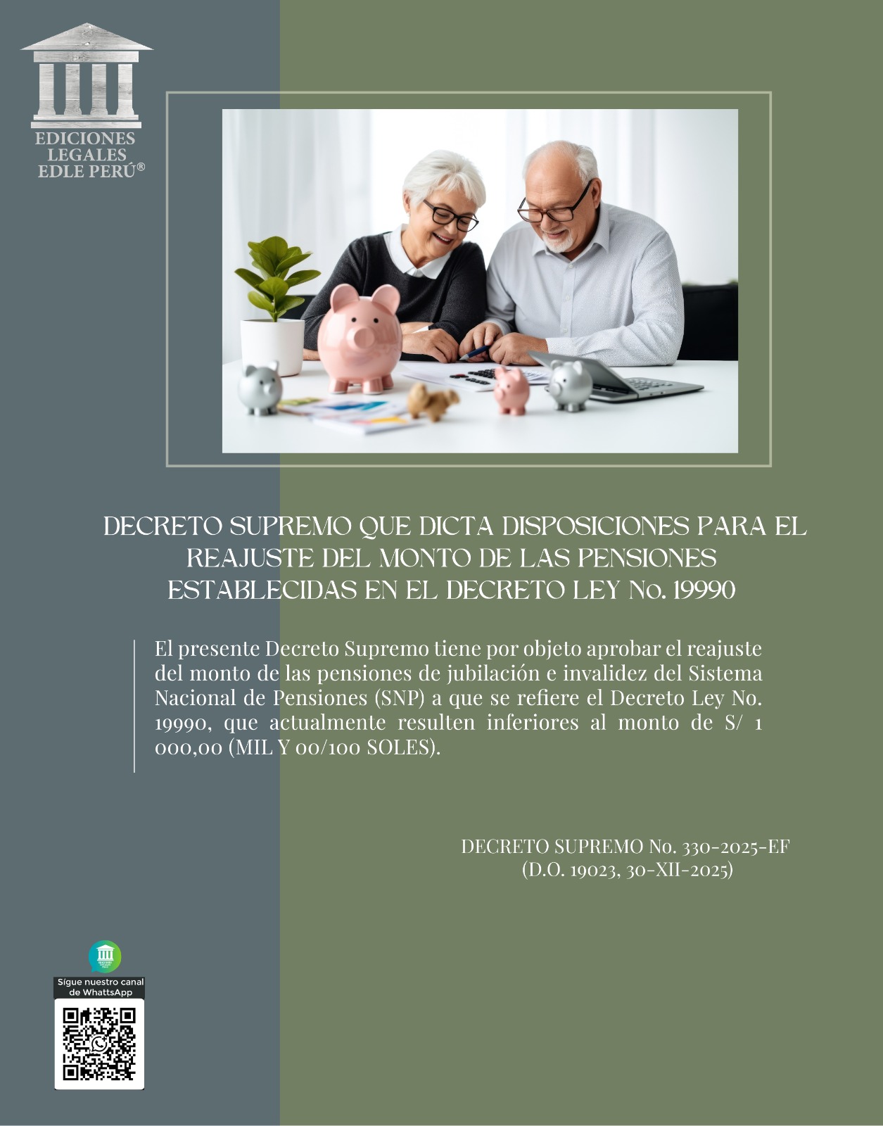 El presente Decreto Supremo tiene por objeto aprobar el reajuste del monto de las pensiones de jubilación e invalidez del Sistema Nacional de Pensiones (SNP) a que se refiere el Decreto Ley No. 19990, que actualmente resulten inferiores al monto de S/ 1 000,00 (MIL Y 00/100 SOLES). DECRETO SUPREMO No. 330-2025-EF (D.O. 19023, 30-XII-2025)