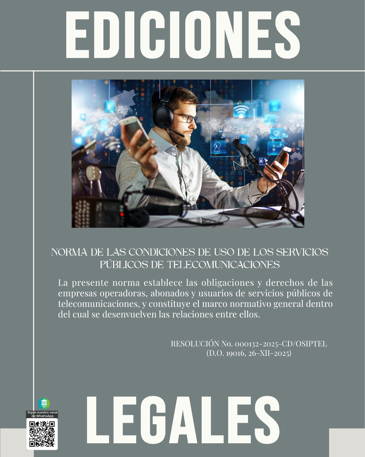 La presente norma establece las obligaciones y derechos de las empresas operadoras, abonados y usuarios de servicios públicos de telecomunicaciones, y constituye el marco normativo general dentro del cual se desenvuelven las relaciones entre ellos. RESOLUCIÓN No. 000132-2025-CD/OSIPTEL (D.O. 19016, 26-XII-2025)