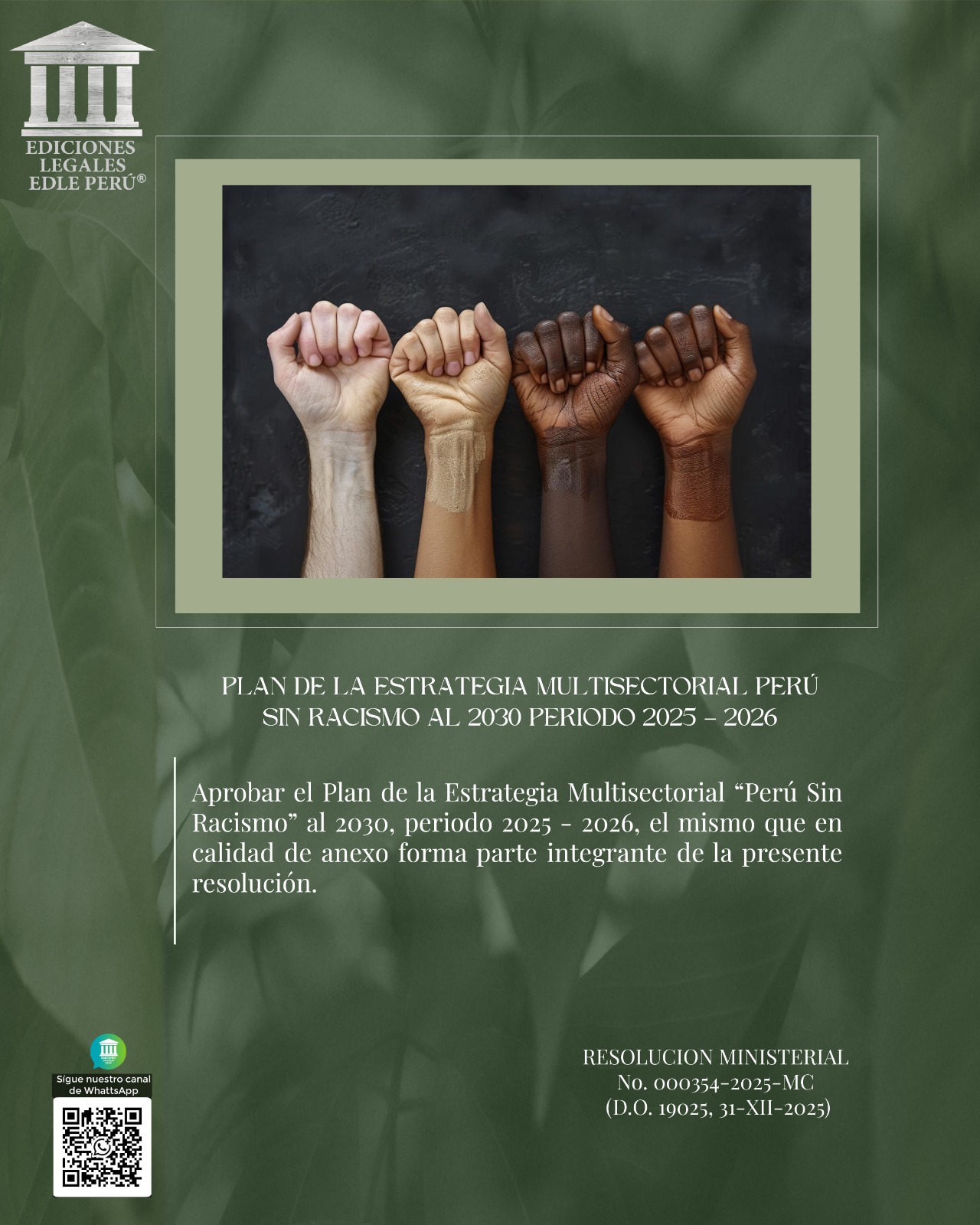 Aprobar el Plan de la Estrategia Multisectorial “Perú Sin Racismo” al 2030, periodo 2025 – 2026, el mismo que en calidad de anexo forma parte integrante de la presente resolución. RESOLUCION MINISTERIAL No. 000354-2025-MC (D.O. 19025, 31-XII-2025)