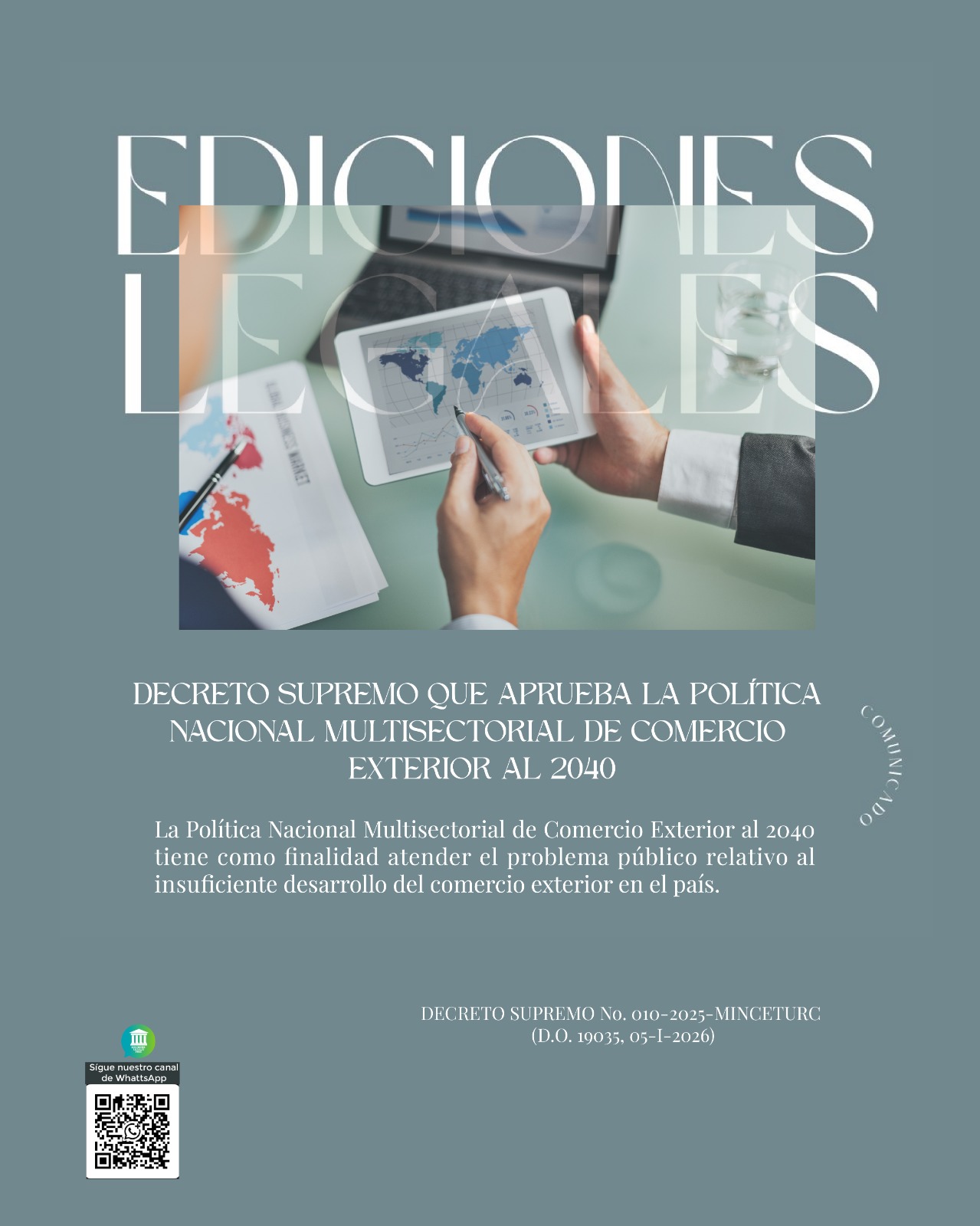 La Política Nacional Multisectorial de Comercio Exterior al 2040 tiene como finalidad atender el problema público relativo al insuficiente desarrollo del comercio exterior en el país. DECRETO SUPREMO No. 010-2025-MINCETURC (D.O. 19035, 05-I-2026)